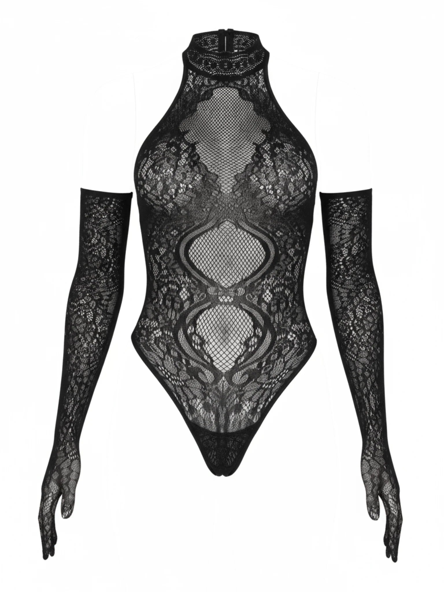 Bring the drama in the best way with this 2 PC lace halter teddy and matching long lace gloves by Leg Avenue. The sheer lace bodysuit hugs every curve just right, while the halter neckline and matching gloves add that extra flirt factor. Perfect for when you’re in the mood to be unforgettable.